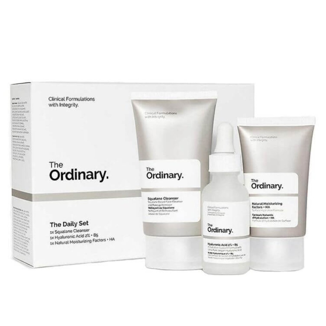 Le Set Quotidien The Ordinary est le point de départ idéal pour une routine de soins simple et efficace, adaptée à tous les types de peau, en particulier les peaux normales, sèches ou mixtes. Ce coffret réunit trois des produits favoris de la marque pour une routine complète de nettoyage, d’hydratation et de protection de la barrière cutanée : le Nettoyant au Squalane (50 ml), un nettoyant doux et hydratant qui élimine efficacement le maquillage et les impuretés tout en respectant la barrière d’hydratation naturelle de la peau ; l’Acide Hyaluronique 2% + B5 (30 ml), un sérum hydratant qui lisse et repulpe la peau en apportant de l’hydratation aux multiples couches de la peau ; et les Facteurs Naturels d’Hydratation + HA (30 ml), une crème hydratante non grasse qui agit comme un supplément topique direct, riche en acides aminés, lipides et acide hyaluronique, pour une hydratation immédiate et durable. Ce set vegan est parfait pour les débutants ou pour les personnes souhaitant simplifier leur routine de soins.