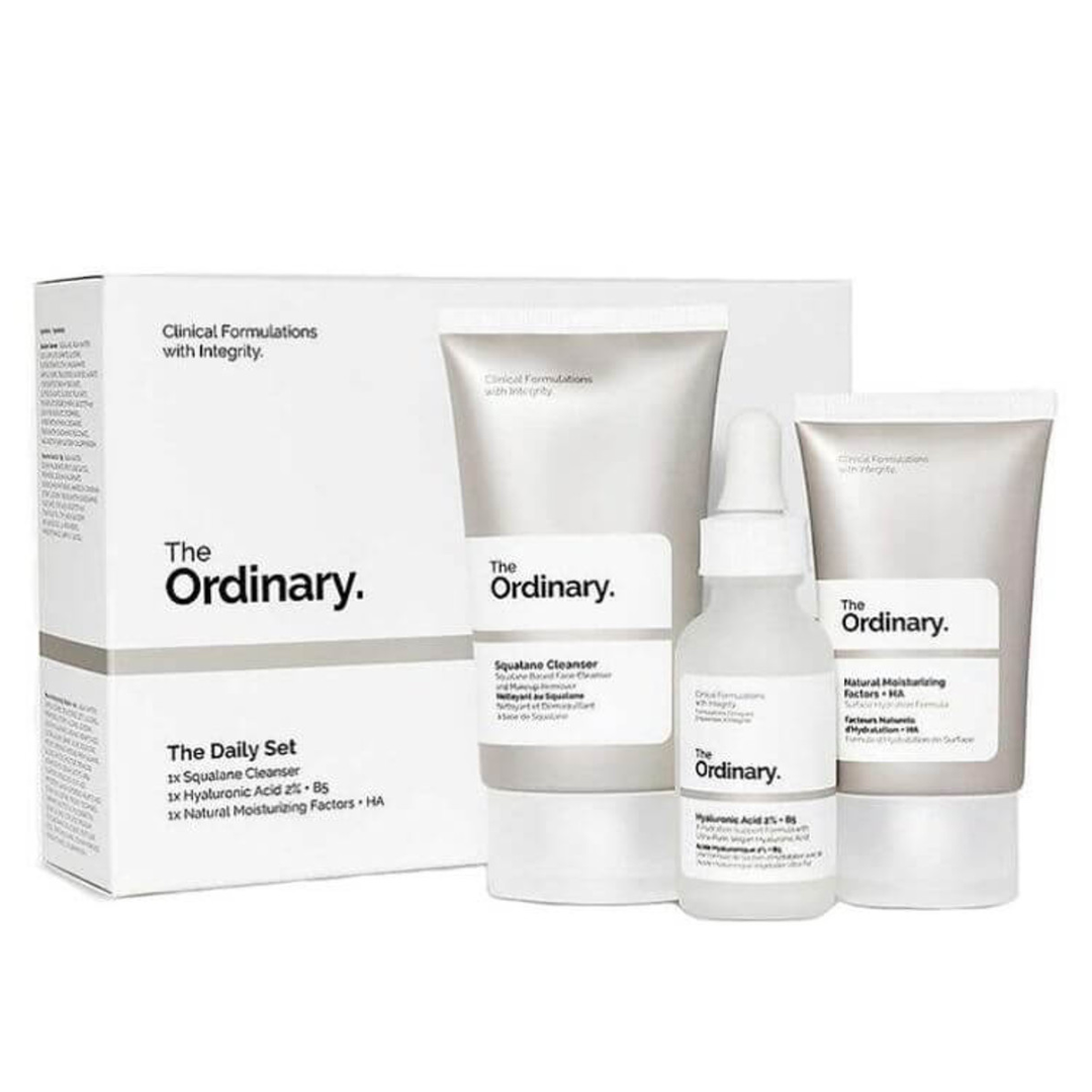Avec le nettoyant au squalane, les facteurs hydratants naturels et le sérum hydratant à l’acide hyaluronique The Ordinary The Daily Set couvre tous vos essentiels de soins quotidiens de la peau !