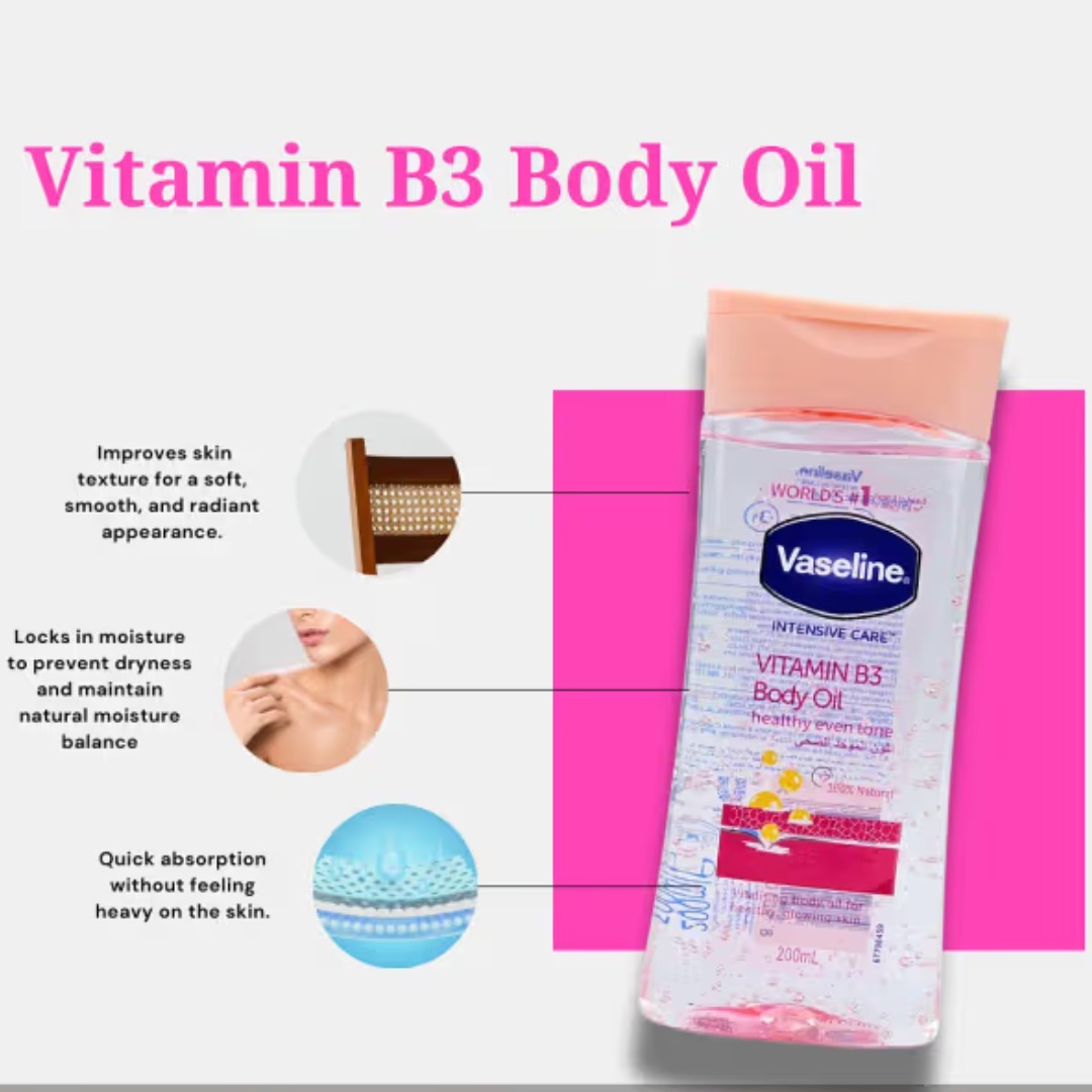 L’huile corporelle Vaseline Intensive Care à la Vitamine B3 est formulée pour nourrir, adoucir et illuminer la peau tout en renforçant sa barrière naturelle. Sa texture légère pénètre rapidement sans laisser de film gras, offrant une hydratation durable et un confort immédiat. Enrichie en Vitamine B3, elle aide à unifier le teint et à améliorer la luminosité de la peau jour après jour.