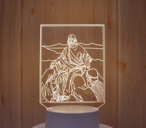 Cette veilleuse LED 3D est un objet de décoration à la fois moderne et spirituel. La plaque en acrylique transparent est gravée d’une représentation de Jésus-Christ enseignant à ses disciples, évoquant la scène du Sermon sur la Montagne. Une fois allumée, la lumière LED intégrée dans la base illumine la gravure, créant un effet tridimensionnel saisissant. Parfaite pour une chambre, un salon ou un espace de prière, cette lampe ajoute une touche de sérénité et de foi à votre intérieur.
